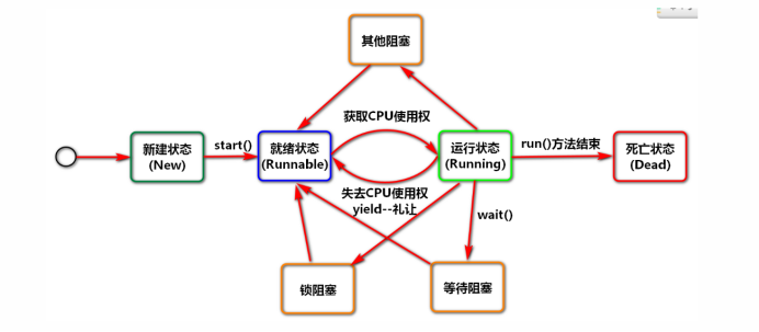 就绪状态(Runnable):处于新建状态中的线程被调用start()方法就会进入就绪状态。处于就绪状态的线程,只是说明此线程已经做好了准备,随时等待CPU调度执行,但并不是说执行了start()方法线程就会立即执行;